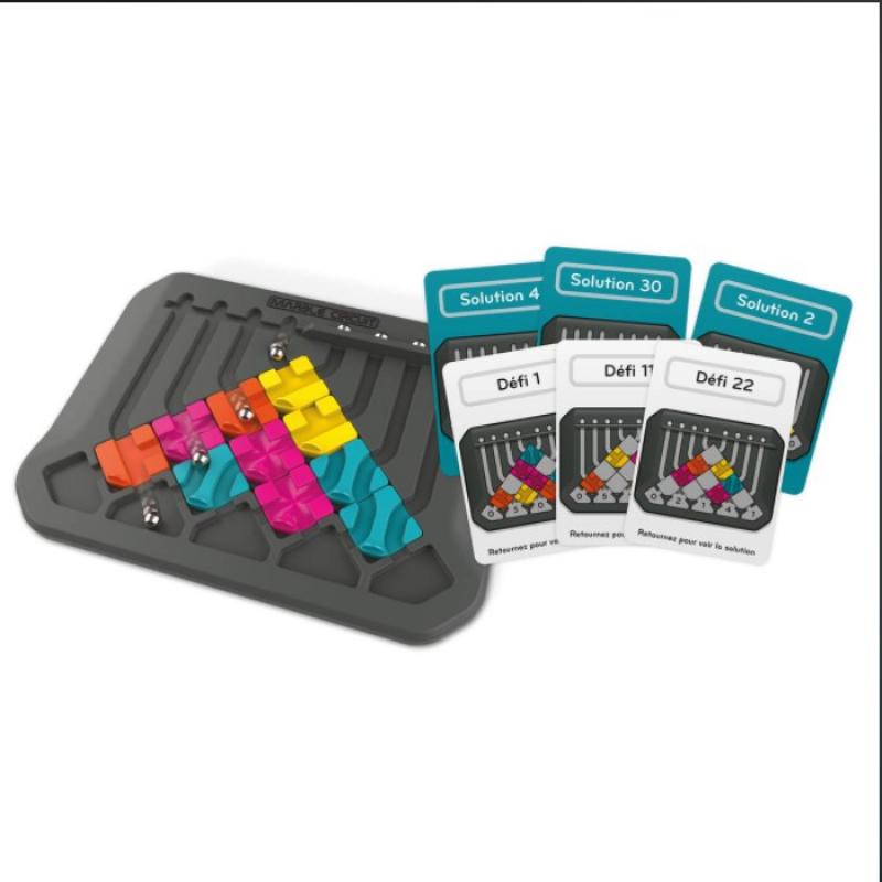 • Contenu : 1 tableau de jeu, 1 barrière, 10 tuiles, 8 billes en acier, 64 cartes Défi, 1 carte de référence et 1 livret de règles.