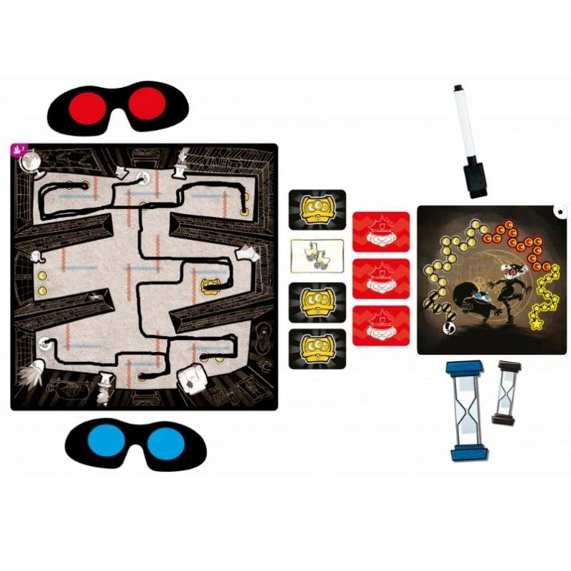 Dans ce jeu coopératif, les joueurs ont 2 minutes pour voler le plus de pièces possible sans toucher les lasers de sécurité présents dans la salle. Pour ce faire, chaque joueur enfile des lunettes dotées d’un filtre de couleur lui empêchant de voir un des types de lasers (rouge ou bleu). Le joueur avec les lunettes rouge doit alors tracer avec le feutre un chemin dans la salle afin de récupérer les pièces, tandis que le joueur avec les lunettes bleu est son guide. À eux de communiquer au mieux pour éviter les obstacles ! Chaque pièce récupérée rapporte 1 point, chaque laser touché fait perdre 1 point. La partie est gagnée si les joueurs ont remporté assez de points pour remplir leur planque au bout de 4 manches.