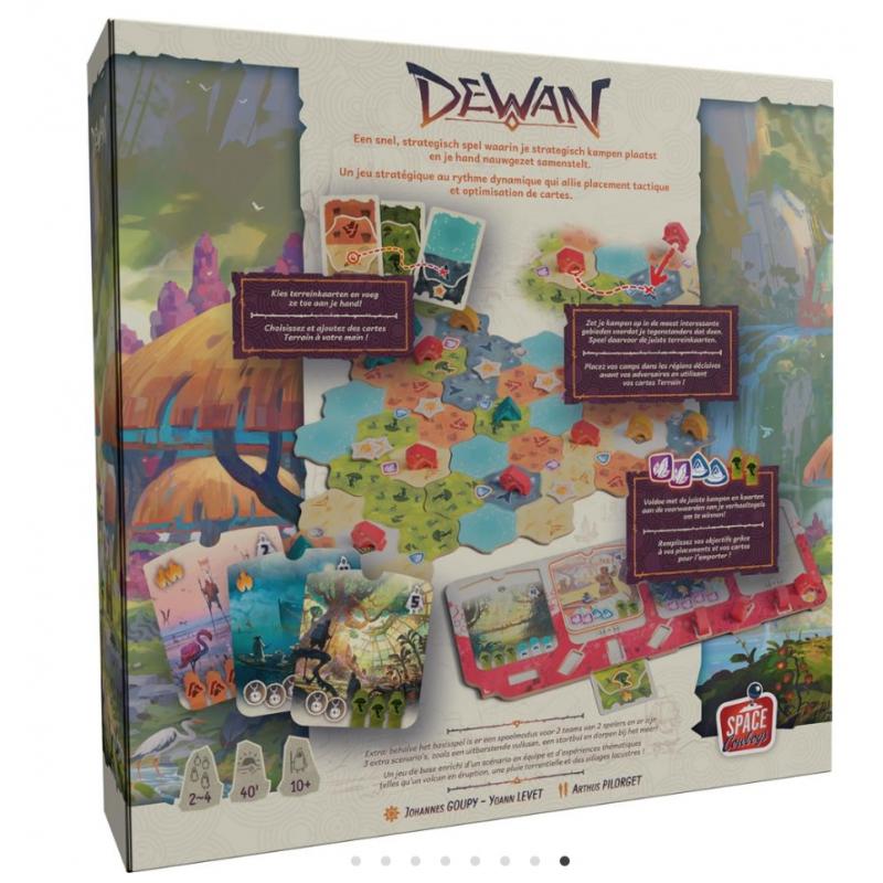 Dans Dewan, chaque joueur incarne une tribu nomade qui explore des territoires redevenus sauvages. En posant stratégiquement vos camps sur les zones clés du plateau, vous récoltez des ressources essentielles et tentez de remplir vos objectifs avant vos adversaires.