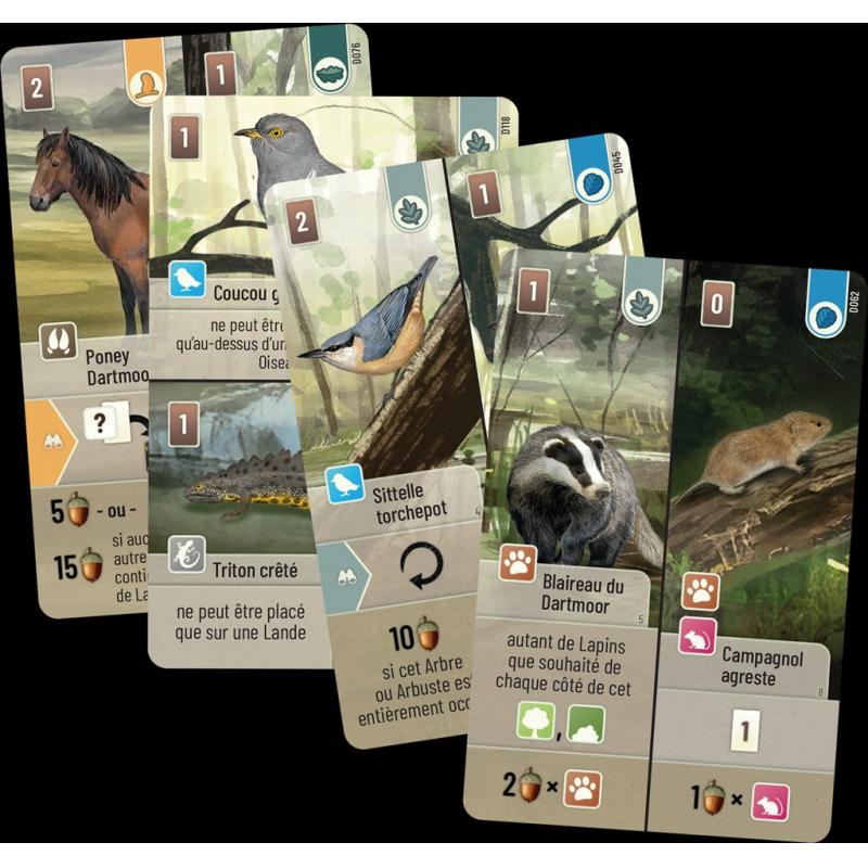 habitat.Chaque carte est une pièce du puzzle vivant que vous allez composer : certains animaux ont besoin d’un type de terrain spécifique (lande, rivière