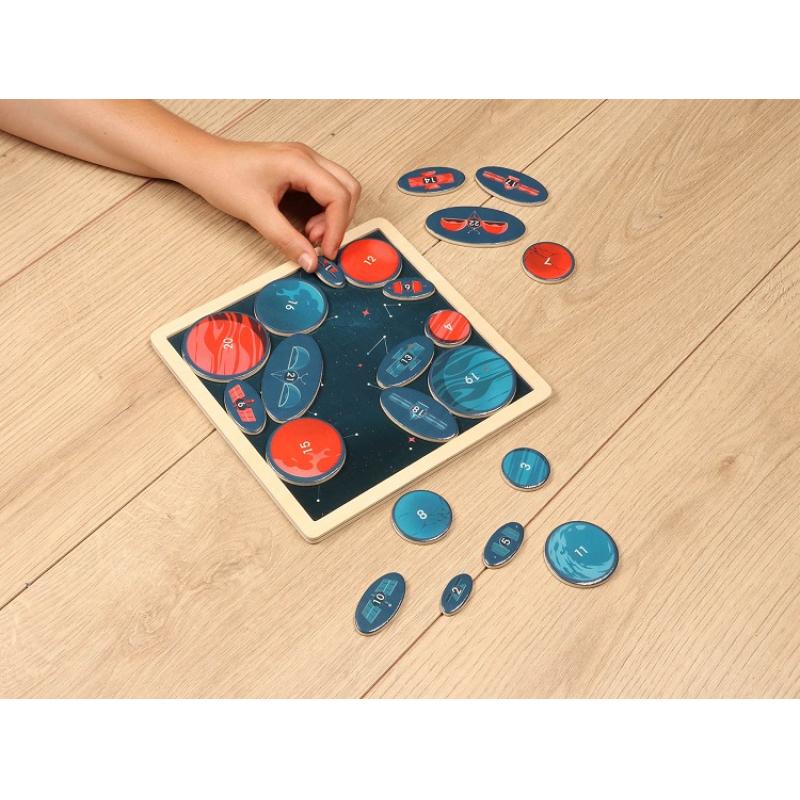 Contenu : 1 plateau en bois magnétique, 10 tuiles Planète en bois magnétiques en bois, 12 tuiles Satellite en bois magnétiques