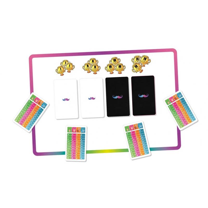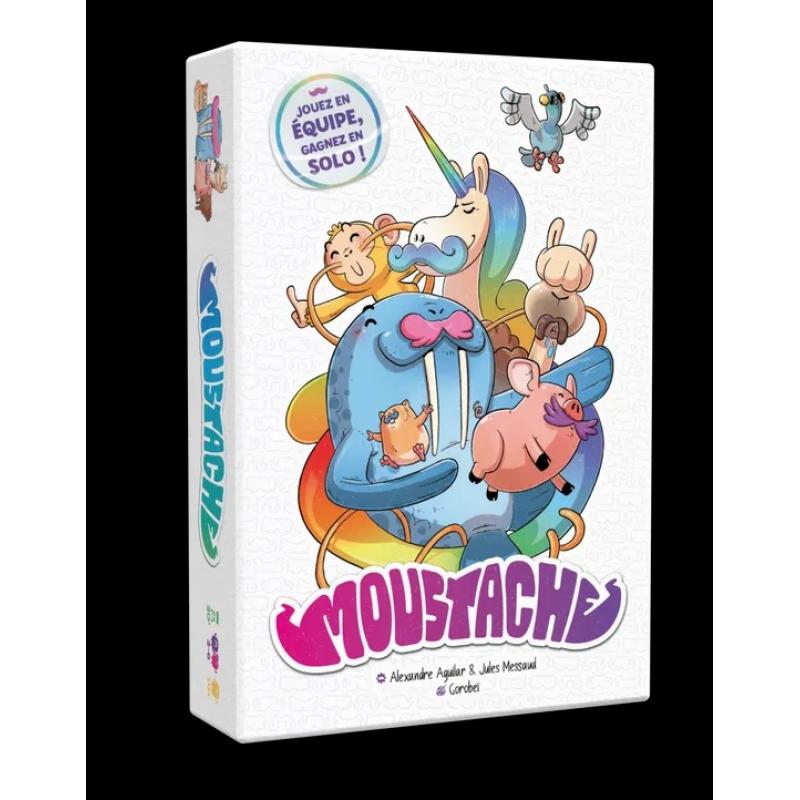 Moustache est un jeu de plis à rebondissements, pour 3 à 6 joueurs. À chaque manche, les équipes sont redéfinies aléatoirement et une nouvelle règle vient chambouler la partie : hiérarchie des couleurs inversée, jokers délirants, effets de cartes... Rien n’est jamais figé ! Grâce à un système de règles évolutives et de cartes Équipe, chaque partie est unique et pousse à l’adaptation constante. On y retrouve le plaisir immédiat du jeu de plis, enrichi d’un goût de chaos contrôlé. Facile à apprendre, drôle à jouer, idéal pour animer une soirée famille ou amis.