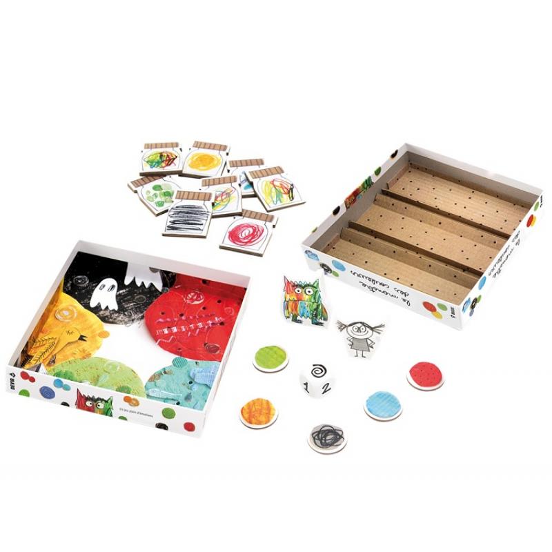 1 plateau au fond de la boîte, 1 jeton de Monstre, 1 jeton de petite fille, un dé, 8 jarres en carton, 2 étagères pour les jarres, 5 marqueurs d'émotion.