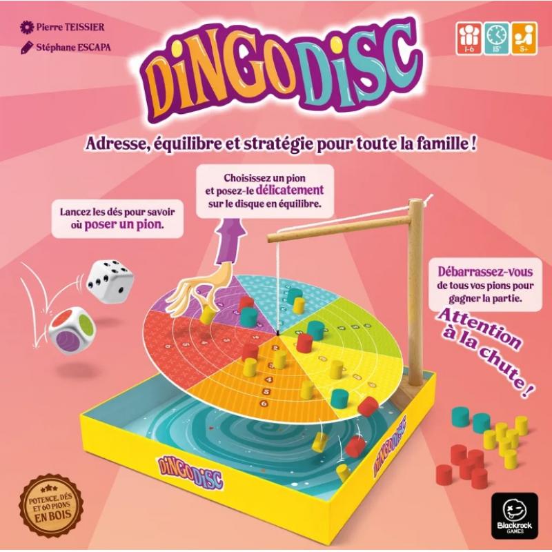 Dingo:Disc est un jeu dadresse, déquilibre, de stratégie et dhabileté où les joueurs doivent poser tous leurs pions sur un disque en équilibre sans faire tomber les pions déjà posés.Chaque joueur à son tour lance les 2 dés. Le dé de couleur détermine la zone de couleurs du disque le dé 6 indique lemplacement de son pion.Le gagnant est le joueur qui aura posé tous ses pions le premier.