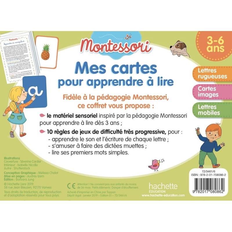 • le matériel sensoriel inspiré par la pédagogie Montessori pour apprendre à lire dès 3 ans : 29 cartes rugueuses, 48 cartes images autocorrectives et 60 lettres mobiles.
