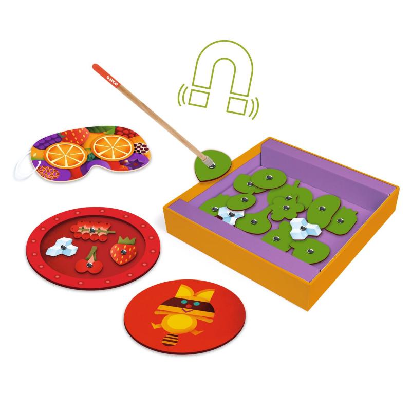1 baguette magnétique + 3 assiettes + 3 couvres assiette + 4 bandeaux avec élastique + 30 tuiles silhouettées avec un rivet métallique au centre