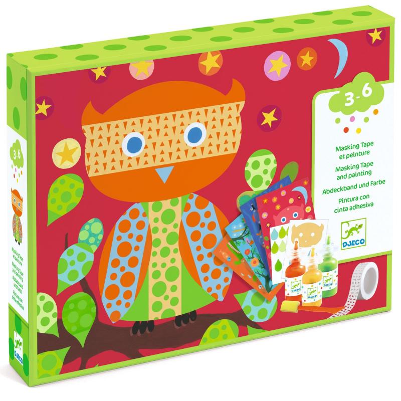 Un grand coffret de peinture sur le th è me des animaux. Apr è s avoir prot é g é la table avec la nappe, l'enfant colle le masking-tape dentel é sur les grandes cartes illustr é es puis peint par dessus. Une fois la peinture s è che, il retire le masking-tape et d é couvre de jolis motifs. Magique !