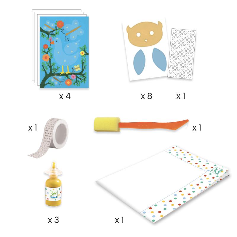4 cartes illustr é es (format A3), 8 planches cartonn é es de pi è ces pr é -d é coup é es, 3 bouteilles de gouache (jaune, vert et orange), 3 rouleaux de masking tape, 3 pinceaux, 1 nappe protection, des autocollants double-face.
