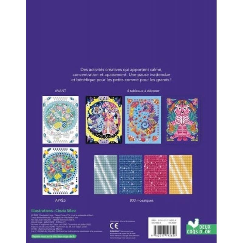 4 tableaux repr é sentant de tr è s beaux animaux à compl é ter (tigre, hippocampe, chat, paon) et à d é corer gr â ce à 800 mosa ï ques en mousse de 4 couleurs diff é rentes (rose, bleu, or et argent). Un code couleur pr é cise o ù placer chaque mosa ï que. Une activit é ludique et cr é ative !
