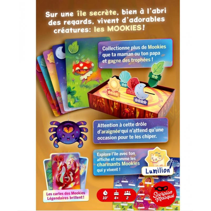 L’île des Mookies est un jeu rapide pour 2 joueurs qui fera l’unanimité chez les petits et les grands. Collectionnez le plus de Mookies de chaque famille pour gagner des trophées ! Arriverez-vous à obtenir les cartes brillantes des Mookies Légendaires ? Et surtout