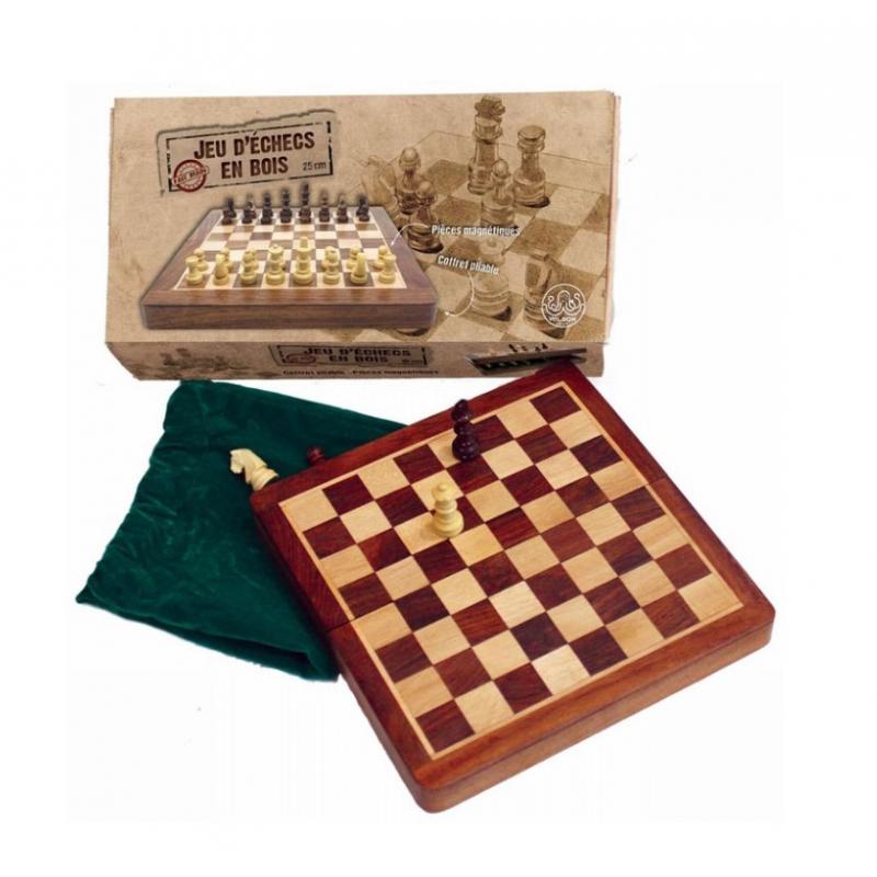 Jeu d'échecs de luxe de 25cm en bois marqueté à partir de deux essences de bois différente. De petite taille, 25 X 12,5 X 6 cm pour être emporté partout. Les pièces magnétiques lui donnent un confort appréciable pour jouer dans le train, en voiture ou sur un bateau. Le roi fait 44 mm de hauteur.Une garniture intérieure permet de ranger les pièces parfaitement pour éviter qu'elles ne s'entrechoquent lors du transport.